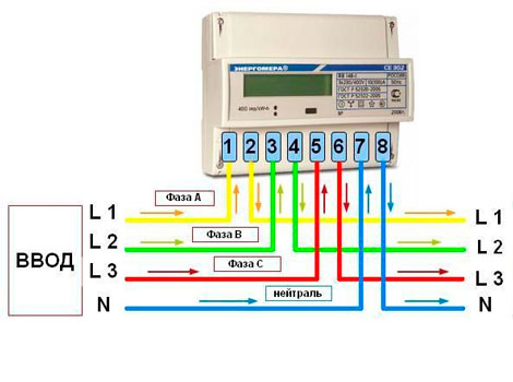 Прямое подключение трехфазного счетчика очень схоже с подключением однофазного. Изображение ниже наглядно показывает, как подключаются кабеля к 3-х фазному электросчетчику: